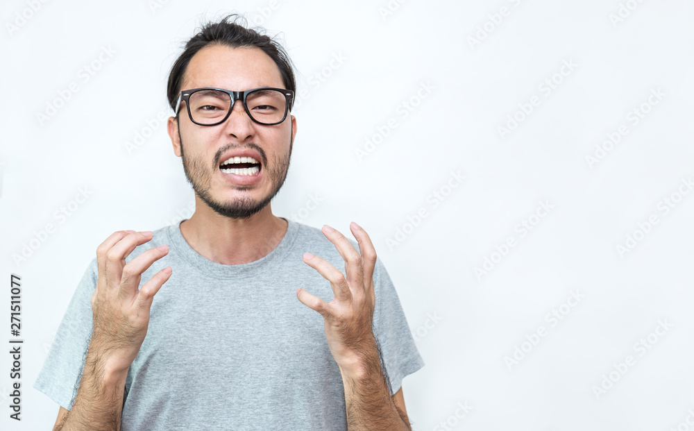 Portrait Of Angry Pensive Mad Crazy Asian Nerd Glasses Man Screaming Out Closeup Young Asian Nerdy Man Isolated On White Background Stress Burnout Office Syndrome Over Load Work Hard Male Concept Stock
